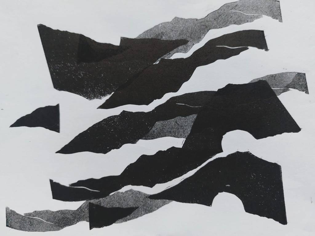I made the fading background by running the top bits of linoleum under the press several times before adding them to the print. Sometimes the resulting scraps become interesting in their own right.